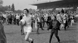 Lex Schoenmaker is zijn shirt kwijt na de bekerzege op Ajax in 1968. - Foto: Beeld/ADO
