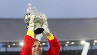Keeper Sander Boschker koestert de zojuist veroverde KNVB Beker - Foto: KNVB Media