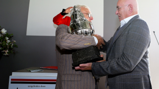Bijna zeventig jaar na dato ontving Quick 1888 de in 1949 gewonnen KNVB Beker uit handen van KNVB-voorzitter Michael van Praag. - Foto: Rob Koppers