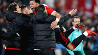 Tonny Vilhena viert de 2-0 met de bank van Feyenoord. - Foto: KNVB Media