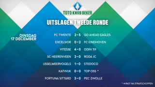 sc Heerenveen plaatste zich eenvoudig voor de achtste finales door Roda JC met 2-0 te kloppen, terwijl FC Eindhoven met dezelfde uitslag Excelsior in Rotterdam opzij zette. In het laatste duel op deze avond stonden de eredivisionisten Fortuna Sittard en PEC Zwolle tegenover elkaar. Waar PEC op 23 november in de competitie thuis nog de sterkste bleek, was het nu Fortuna dat de volle winst - en daarmee een plek in de achtste finale - greep. Bij rust stond het via goals van Sambou en Karjalainen al 2-0 en nadat Lachman in de tweede helft in eigen doel scoorde, was de wedstrijd gespeeld.