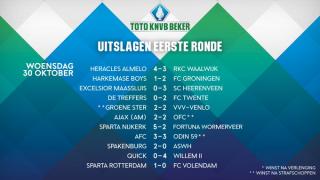 De uitslagen van de op woensdag 30 oktober gespeelde wedstrijden in de eerste ronde van de KNVB Beker.