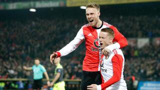 Nicolai Jørgensen en Sam Larsson juichen na de eerste treffer van Feyenoord tegen PSV in de kwartfinale. - Foto: KNVB Media