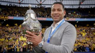 Henk Fraser glundert met de KNVB Beker die Vitesse in 2017 won.