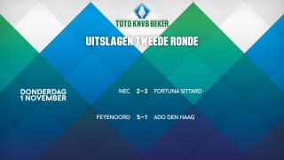 Feyenoord en Fortuna Sittard hebben zich donderdag als laatste geplaatst voor de achtste finale van de TOTO KNVB Beker. De Rotterdammers waren in eigen huis met 5-1 te sterk voor ADO Den Haag. De ploeg van René Eijer won met 2-3 op bezoek bij NEC.