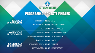 Het programma voor de achtste finales van de TOTO KNVB Beker is bekend. Stuntploeg ODIN '59 neemt het op woensdagavond in eigen huis op tegen SC Heerenveen, Ajax gaat diezelfde avond op bezoek bij Roda JC en donderdag ontvangt Feyenoord in de eigen Kuip het de laatste tijd prima presterende FC Utrecht van trainer Dick Advocaat.