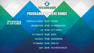 Woensdagavond staan er opnieuw zeven wedstrijden op het programma in de tweede ronde van de TOTO KNVB Beker, met onder meer de wedstrijd tussen Ajax en Go Ahead Eagles. Donderdag wordt bekend welke teams zich als vijftiende en zestiende plaatsen voor de derde ronde van het bekertoernooi. De loting wordt zaterdag verricht door RKC-spelers Etienne Vaessen en Darren Maatsen.
