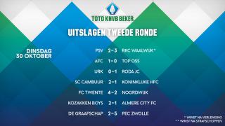 Ook AFC bekerde door naar de volgende ronde. De Amsterdammers wonnen met nipt verschil van FC Oss, 1-0. Voor Noordwijk, Koninklijke HFC en Urk zit het bekertoernooi erop. Hoewel de amateurs zich kranig verweerden, waren FC Twente, Cambuur en Roda JC uiteindelijk net te sterk. PEC Zwolle plaatste zich dinsdagavond als zevende team voor de derde ronde van de KNVB Beker. De ploeg van John van ’t Schip won overtuigend van De Graafschap: 5-2.