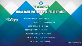 Op de herfstachtige woensdagavond stonden nog zes andere duels op het programma. Achilles Veen (2-0 tegen Gemert) en OSS'20 (0-1 bij Koninklijke HFC) slaagden erin hun op een hoger niveau spelende tegenstander uit te schakelen. Nizar Mekkaoui was de grote held van Kozakken Boys. In Werkendam leek de thuisploeg tegen DEM op een verlenging af te stevenen, maar ver in de extra tijd (93e minuut) knalde Mekkaoui een schot van afstand prachtig tegen de touwen: 1-0.