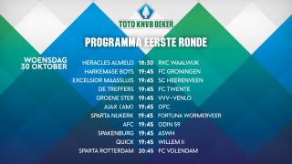 De eerste ronde van de TOTO KNVB Beker wordt woensdagavond vervolgd. Om 18.30 uur staan in Almelo de eredivisionisten Heracles en RKC Waalwijk tegenover elkaar. Daarnaast staan er verschillende duels tussen amateurclubs en profs op het programma. Het volledige programma is hieronder te zien.